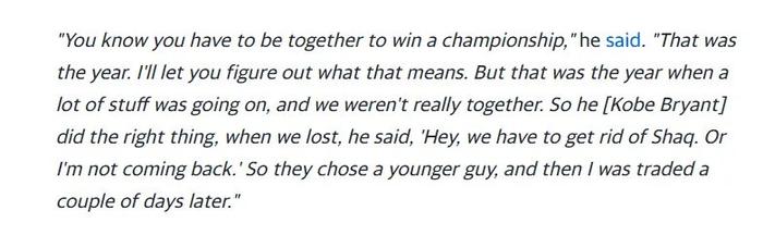 在谈到这届总决赛的时候,奥尼尔这样说道:“要想赢得总冠军,球队必须团结一致。关于那一年的事情,我就不多说了,你们自己去琢磨吧。那一年发生了太多事,我们根本就没团结起来。所以,科比在我们失利后做了正确的事,他说,’嘿,我们必须送走奥尼尔,否则我就不回来了。于是湖人队就选择了更年轻的他,没过几天我就被交易了。”
